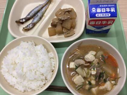 今日の給食の献立は、「豚汁・大根の煮物・ししゃも・ご飯・牛乳」です。豚汁も大根の煮物も、程よい味付けで具材の味が生かされ、美味しくいただきました。