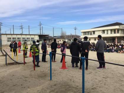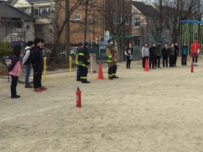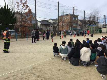 今回の避難訓練には、枚方東消防署 長尾出張所より、4名の消防士の方々に来校いただき、子どもたちに、火災時に避難するための留意事項等についてお話ししていただきました。