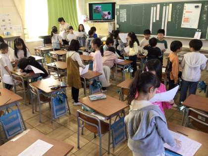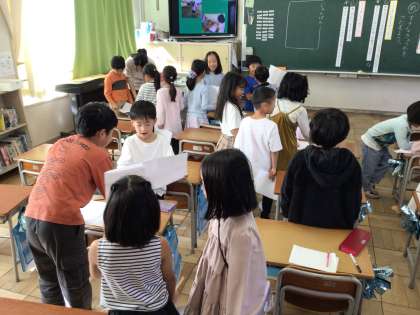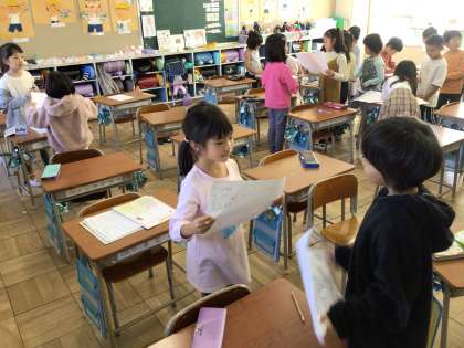 5限目の参観授業のための「好きな教科 と 好きな理由」「・・・が好きです。なぜならば・・・だからです」の基本の型で練習しています。学級内を移動し、色々な友だちに発表を聞いてもらい、用紙の裏にサインをもらっています。子どもたち一人ひとりが、懸命に練習しています。