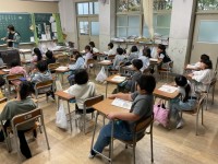 「竹切り体験」では、一定の長さに切られた竹を各班ごとで協力して取り組んでいました。竹を台の上に載せ、班の仲間に抑えてもらい、懸命にノコギリで切っていました。ノコギリを使って切ることが初めての子どももいましたが、どの子どもも、苦労しながら頑張って切っていました。出来上がったものを見て、ペン立て、或いはコップしようと考えているようでした。