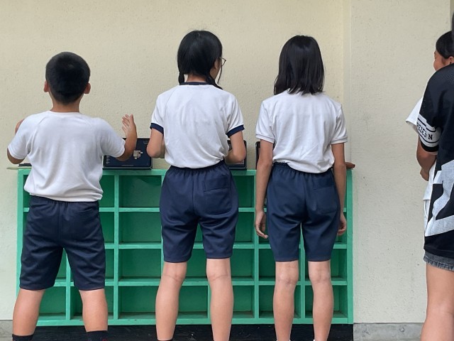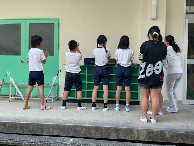 中休み、校舎に元気な声が響いてきました。「どこから聞こえるのだろう?」と探してみると、体育館前で紅組の応援団の子どもたちが練習に励んでいました。昨年度の運動会での応援の様子をタブレットで確認しながら、声を張り上げ、動きの確認もしっかり行っています。仲間同士で声をかけ合いながら、リズムを合わせたり手の動きを揃えたりする姿から、真剣さが伝わってきます。
