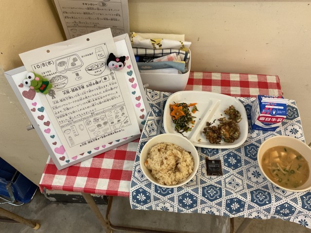今日は「大阪・関西万博特別メニュー」の最終日でした。本日の給食は、かやくご飯、小松菜とツナの和え物、お好み揚げ、味噌汁、そして牛乳です。これまで世界各国の料理を楽しんできましたが、最後を飾るのはやっぱり大阪の味、お好み揚げです。外はパリッと、中はふんわりとした食感で、子どもたちも夢中になって食べていました。