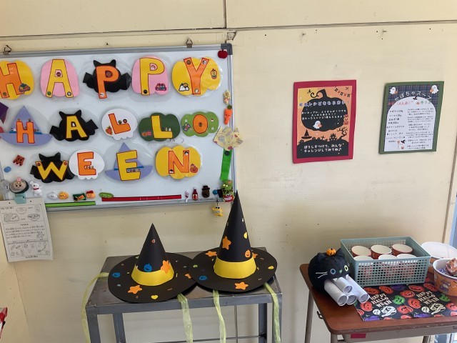 今日、調理場がハロウィン仕様になっていて、子どもたちは入ってくるなり大喜び!「かわいい!」「扉に手形がいっぱい!」と笑顔があふれました。さらに調理員さんたちは、ハロウィンのデコレーションだけでなく、ゲームも用意してくれていました。「昼休みとかに遊びに来てほしいな」と話す調理員さんの工夫で、子どもたちは楽しさ倍増。いつも給食を作ってくれるだけでなく、季節の行事も一緒に楽しめる調理場に、感謝の気持ちでいっぱいです。