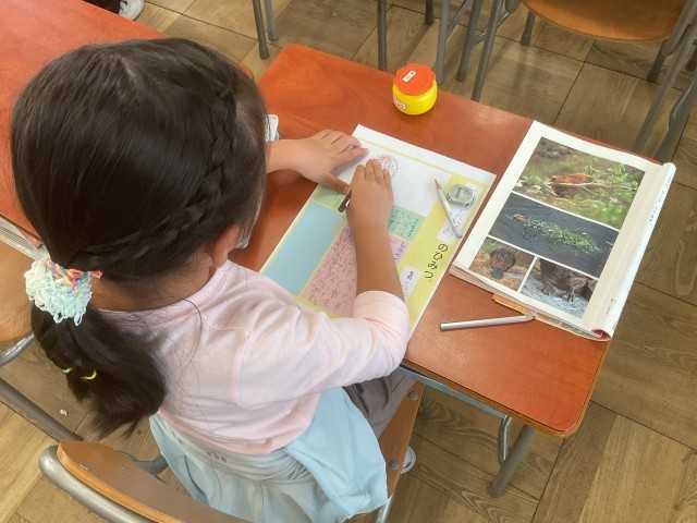 今日は、「ビーバーのひみつを選んでまとめよう」をめあてに学習を進めました。自分が選んだビーバーの秘密について、その特徴や調べてみて分かったことなどをまとめていきました。早く書き終えた子どもは、他の動物の秘密を探すために、教室にあらかじめ設置されている図鑑などを手に取り、学びを広げていっていました。