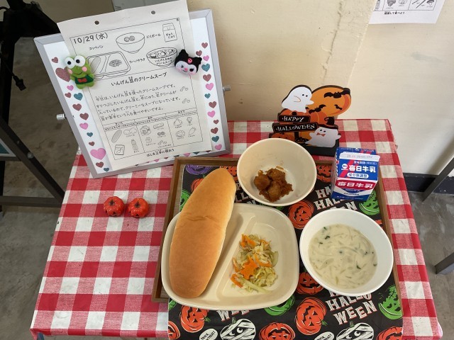 本日の給食は、コッペパン、ラハノサラタ、インゲン豆のクリームスープ、にくボール、牛乳でした。ラハノサラタはギリシャの家庭料理で、キャベツや人参を使ったさっぱりとしたサラダです。インゲン豆のクリームスープはやさしい甘みがあり、寒くなってきたこの季節にぴったりの温かい一品でした。主菜のにくボールは、食べごたえがありつつも味付けがやさしく、パンとの相性も抜群。彩りも良く、栄養のバランスがしっかり取れたメニューでした。