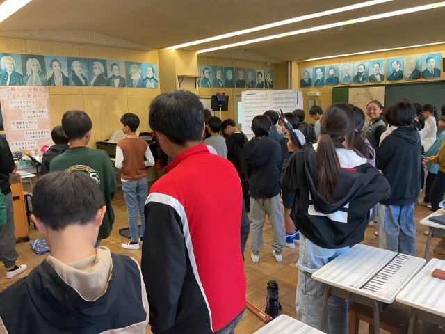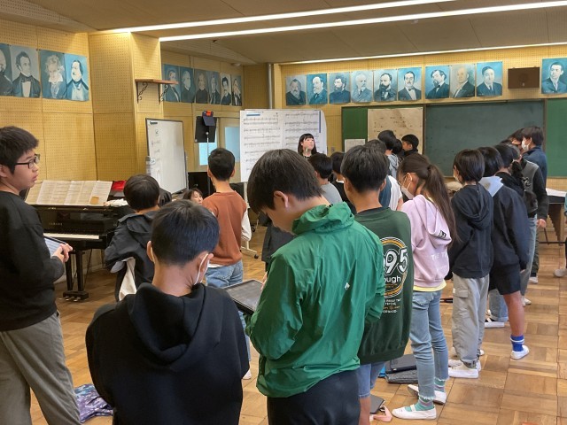 音楽室から素敵な歌声が聴こえてきたので行ってみると、6年生が修学旅行のセレモニーで歌う曲を練習していました。曲は「ヒロシマのある国で」と「HEIWAの鐘」。どちらも平和を願う気持ちが込められた合唱曲です。子どもたちは一人ひとりの声を大切にしながら、心を合わせて美しいハーモニーを響かせていました。その歌声から、「平和の大切さを伝えたい」「ヒロシマで歌いたい」という思いが伝わってきました。本番では、聴いてくださる方々の心に、そしてヒロシマの地に、子どもたちの歌声が届くことを願っています。