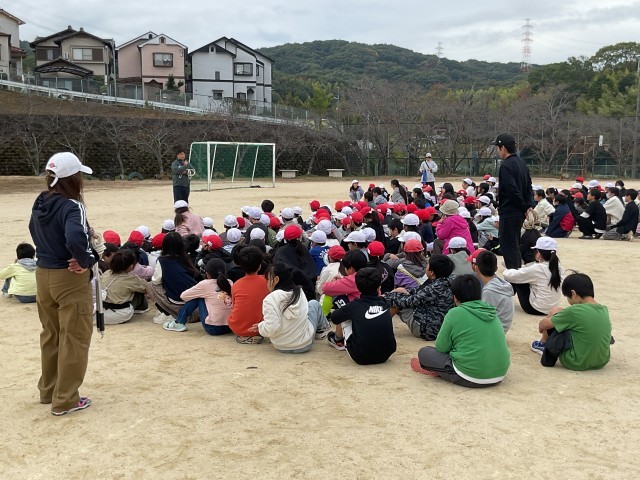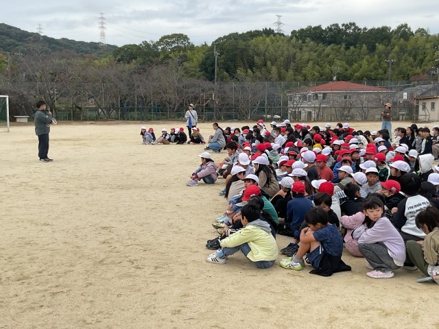 今日、本校では「大縄大会」後でちょうど運動場に全員がいたタイミングでしたので、運動場の中心部分に集まる避難行動を取りました。担当の先生からは、次のようなお話がありました。