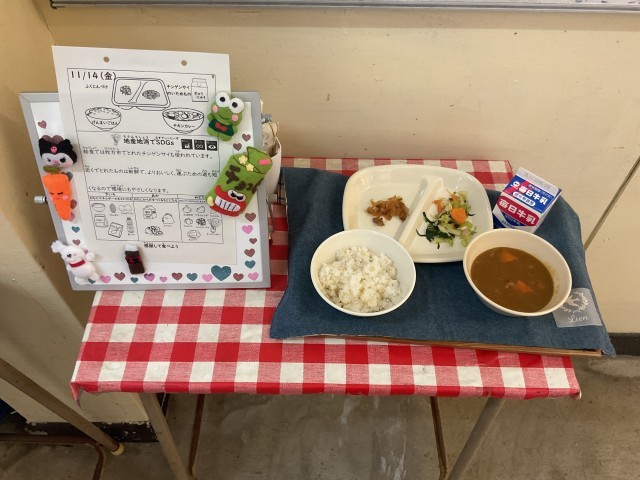 本日の給食メニューは、玄米ご飯、チキンカレー、チンゲンサイの炒め物、福神漬けでした。
