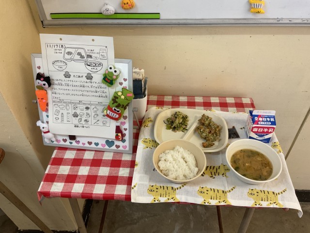 本日の給食は、ご飯、味噌汁、たこ揚げ、小松菜の胡麻炒め、牛乳でした。