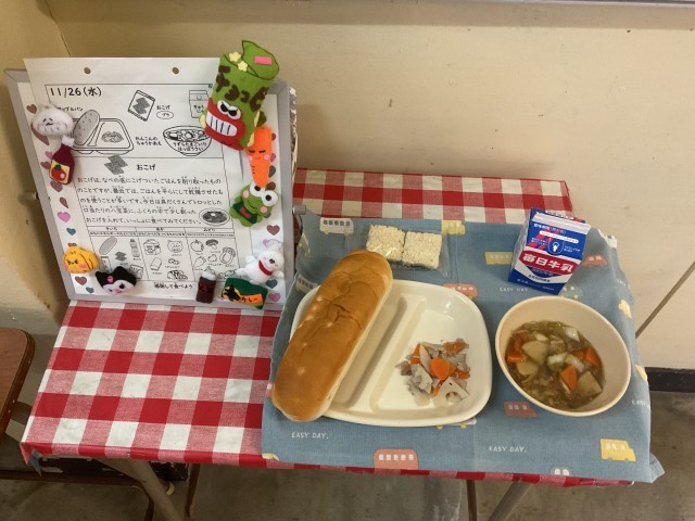 アップルパン、うずら卵入り八宝菜、レンコンの中華和え、おこげ、牛乳 でした。