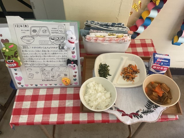そんなお話にちなんだ今日の給食では、大根の葉は炒り煮に、白い根の部分は豚肉と一緒にじっくり煮込まれ、どちらもとてもおいしくいただきました。葉っぱは香ばしくご飯にぴったり。煮物の大根は味がしっかり染みて温かい一品でした。ささみと人参の甘ず和えはさっぱりしていて、全体のバランスをよくしてくれました。