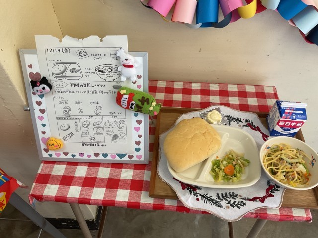 本日のメニューは、オリーブパン、ささみとキャベツのソテー、冬野菜の豆乳スパゲティ、型抜きチーズでした。