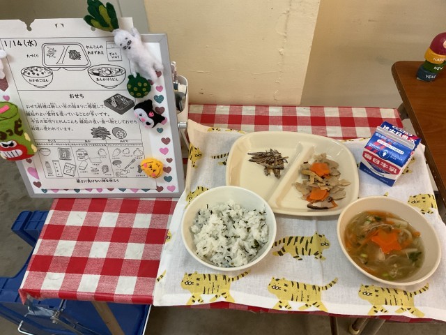 とろみのあるあんかけうどんは、寒いこの時期に体の中から温まる一品で、子どもたちも嬉しそうに食べていました。田づくりや蓮根の甘酢和えは、お節料理としても親しまれている食材で、新しい年の始まりを感じさせる献立でした。季節や行事を大切にした、心温まる給食となりました。
