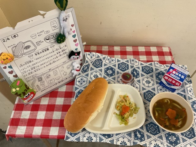 ささみとキャベツのソテーはやさしい味付けで、コッペパンによく合っていました。カレーうどんはほどよいとろみがあり、寒い一日でしたが、食べると体がぽかぽかと温まりました。デザートのミニぶどうゼリーも、さっぱりとした後味で、子どもたちに好評でした。