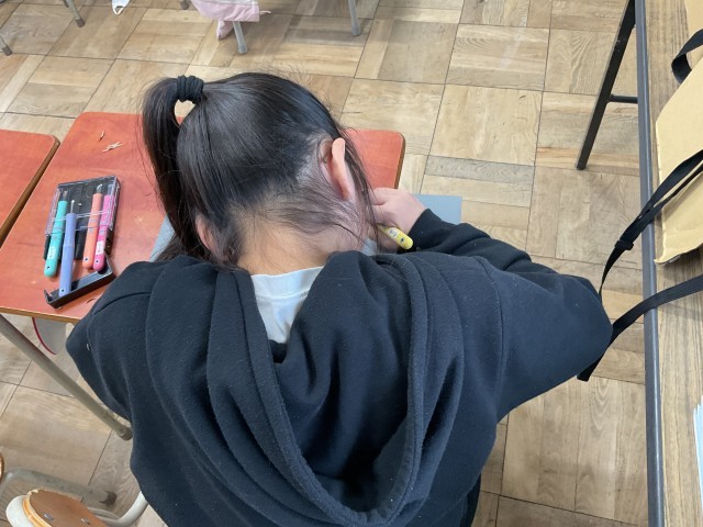 4年生の図工は、彩色版画の制作が次のステップへと進んできています。下絵を写し終えた子どもたちから、いよいよ彫刻刀を手に取ります。