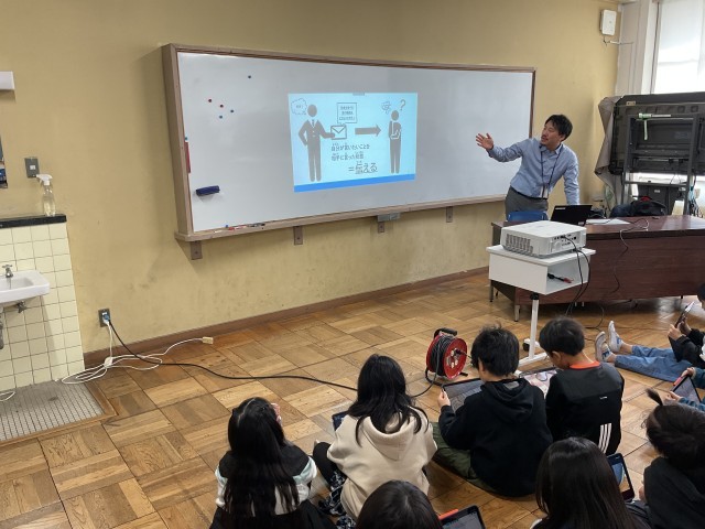 本日は、枚方市広報プロモーション課からお二人の講師をお招きし、4年生が「情報の伝え方」について学びました。子どもたちは今、地域の竹林問題解決に向けて、メンマ販売や竹灯籠作りを広める活動に取り組んでいます。
