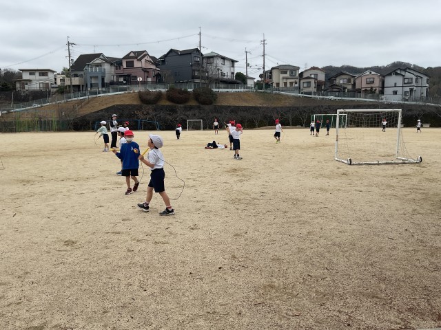 前跳びや後ろ跳びだけでなく、あや跳びや交差跳びに挑戦する子も増えています。縄跳びでは、多様な動きを通して、自分の体を巧みに操る感覚を養っていきます。子どもたちは時間いっぱい運動の楽しさを全身で味わっていました。