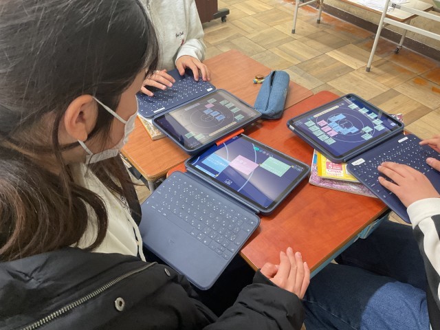 授業中、子どもたちはロイロノートの共有機能を使い、互いの調査内容をリアルタイムで参照し合っていました。「友達はこんな視点で調べているんだ」と、他者の考えを自分の学びに柔軟に取り入れる姿が見られました。一人で完結せず、対話的に情報を深めていく姿勢に、最高学年らしい知的な成長を感じるひとときでした。
