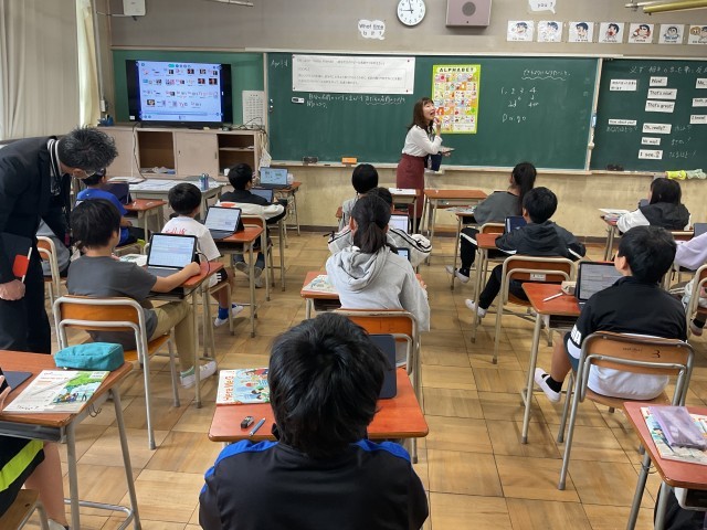 外国語教室では、元気な英語のやり取りが響いていました。今日はアルファベットの読み方を確かめた後、お互いの名前の綴りを教え合う学習に取り組んでいました。