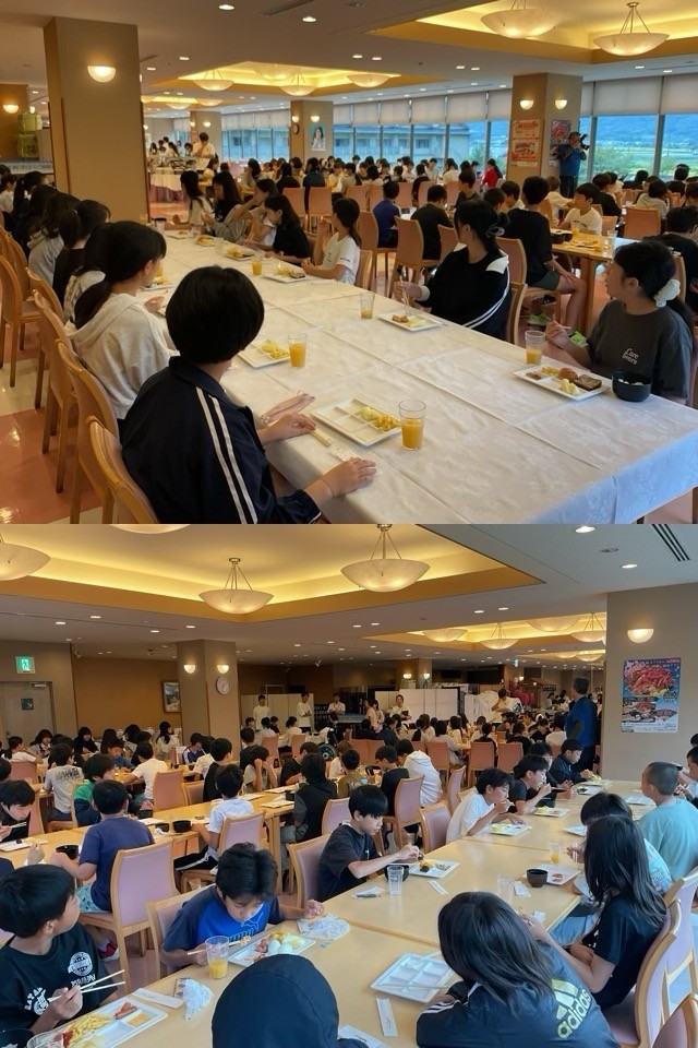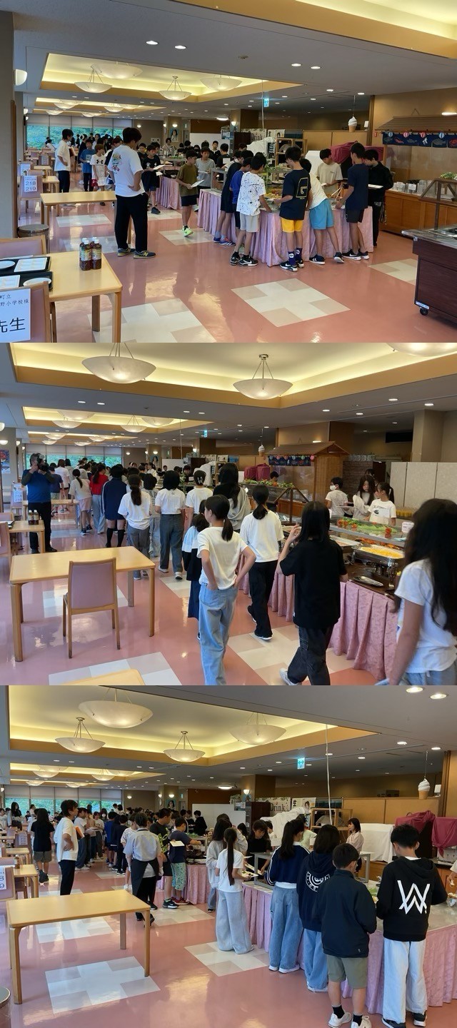 起床時刻に起きて。早速、食堂に集合し、バイキングで、美味しい朝食をいただきました。