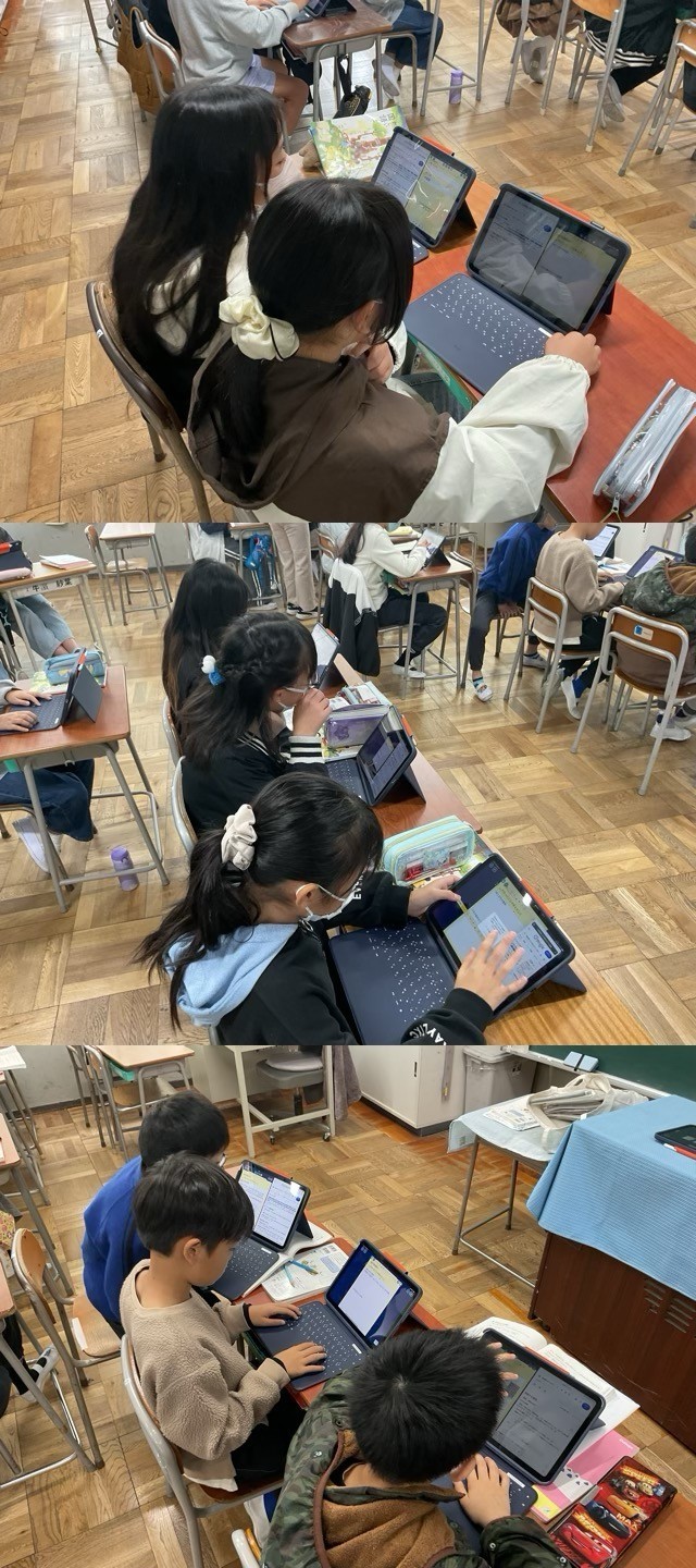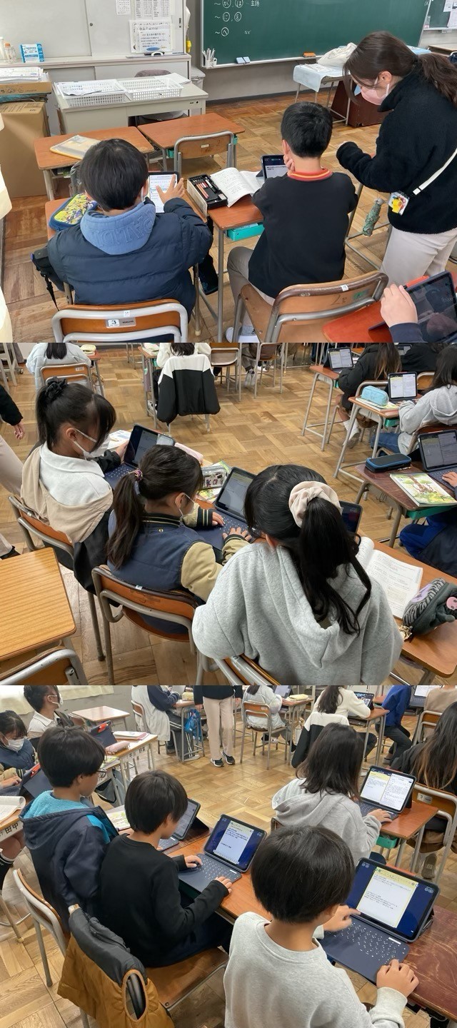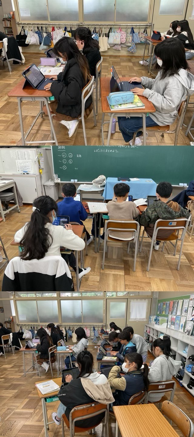 5年生は、タブレット端末を使って、国語の文法、助詞について、わかったことをまとめていました。