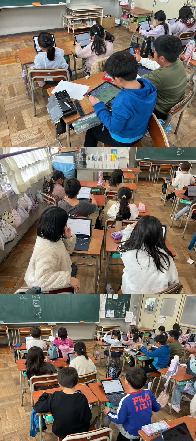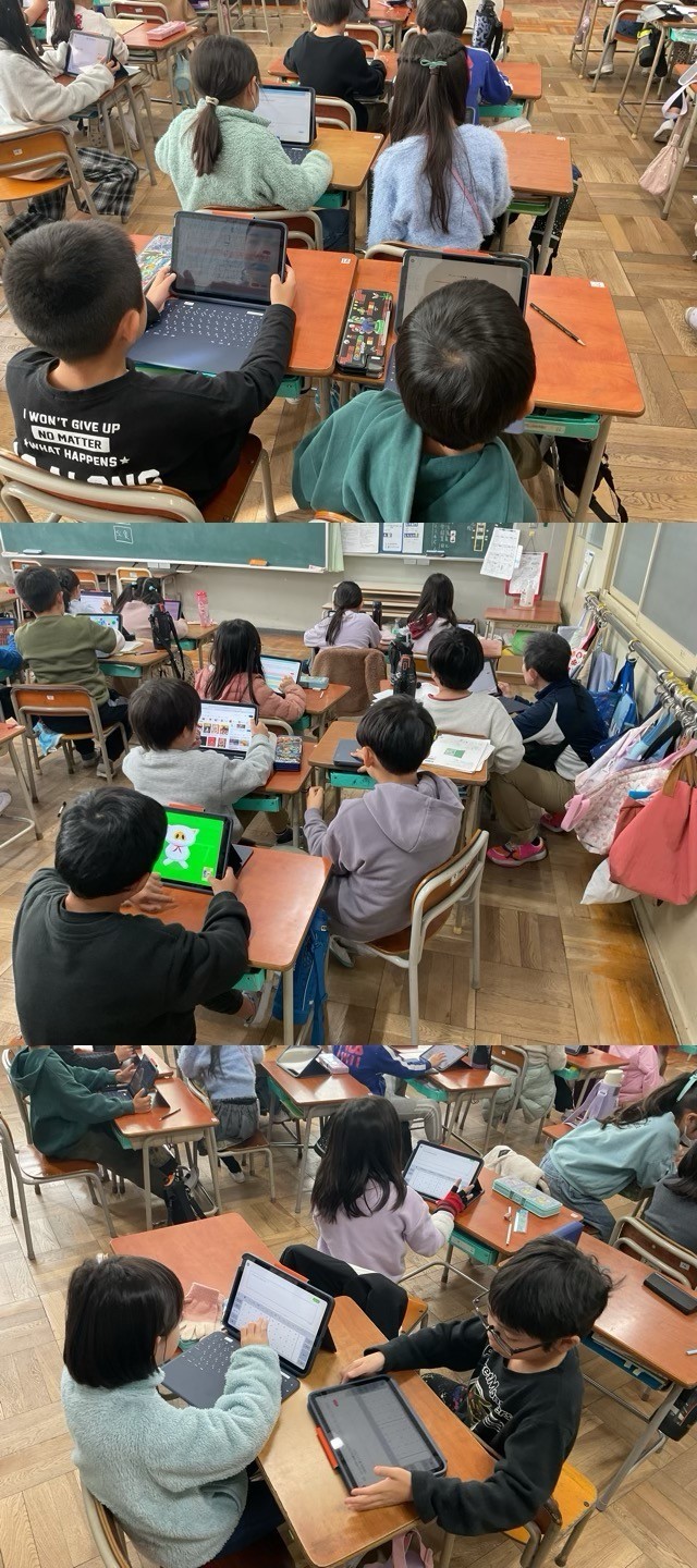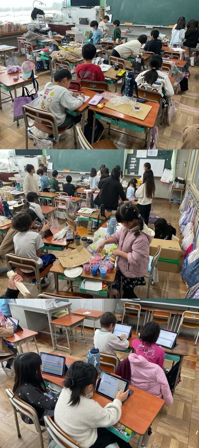 2年生は、お店やさんの準備に大忙しです。また、タブレット端末を使って、6年生がつくったアンケートに答えていました。