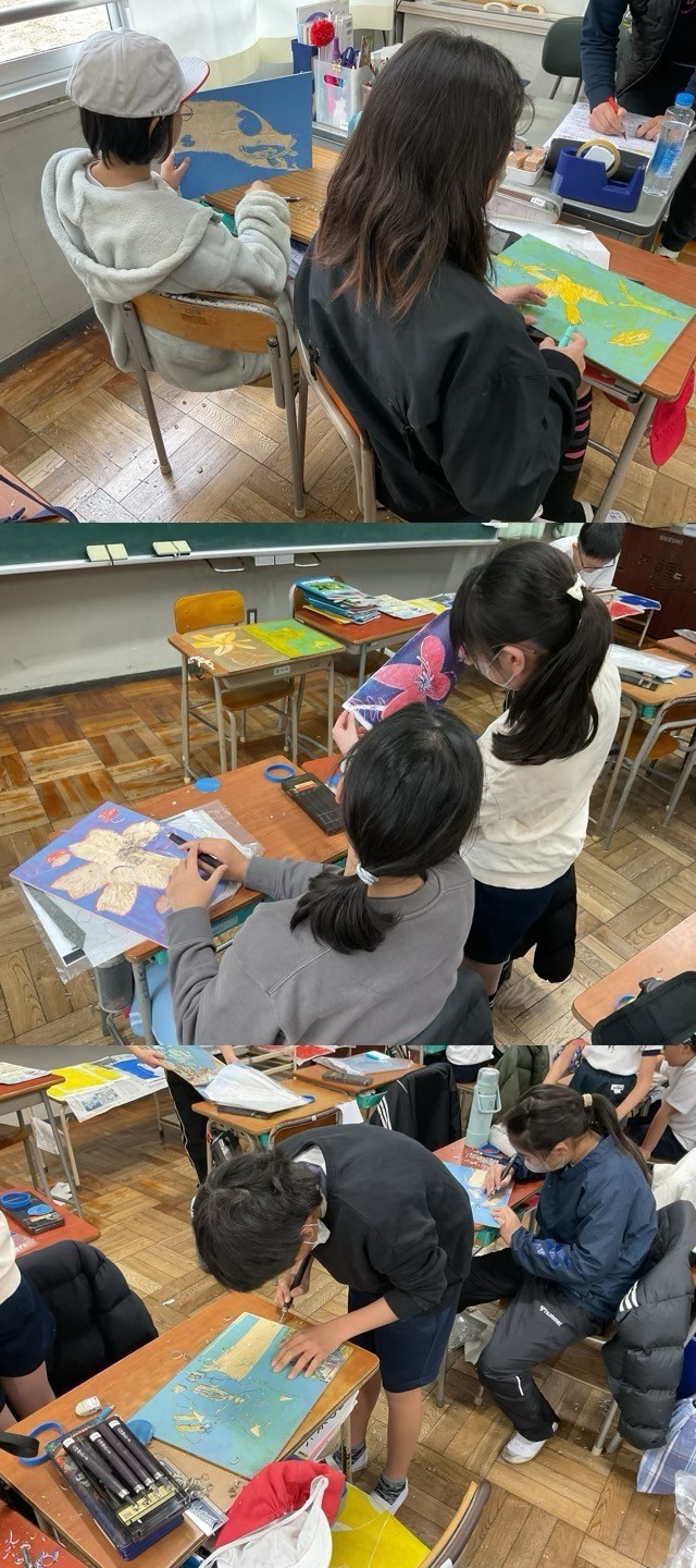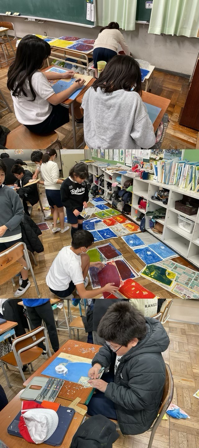 5年生は、彫刻刀を上手に使って、集中して、版画の作品作りを頑張っていました。