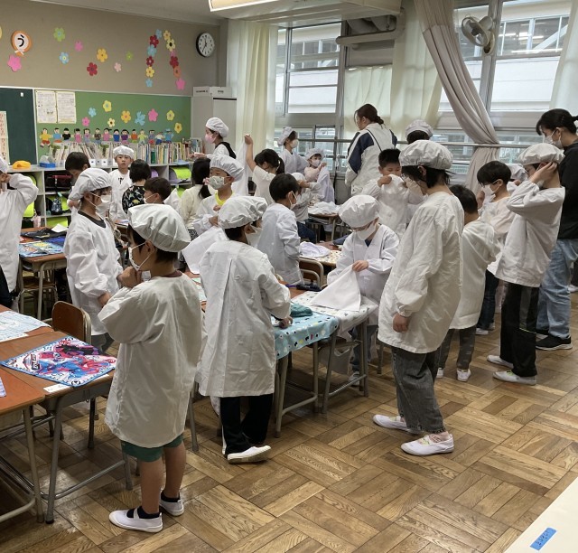 エプロンへの着替えを横でサポートするのは、頼もしい6年生。