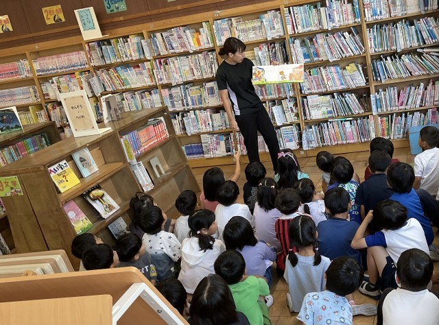 図書室から、楽しそうな笑い声が聞こえてきます。のぞいてみると、担任の先生が絵本の読み聞かせをしていました。先生の楽しい読み方に、子ども達、嬉しそうな笑顔です。