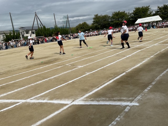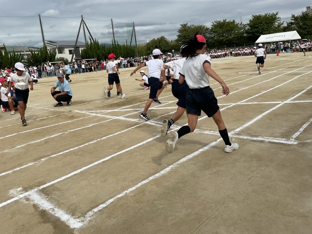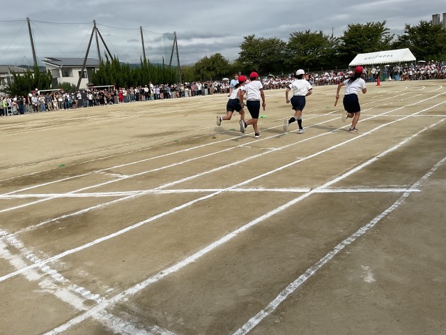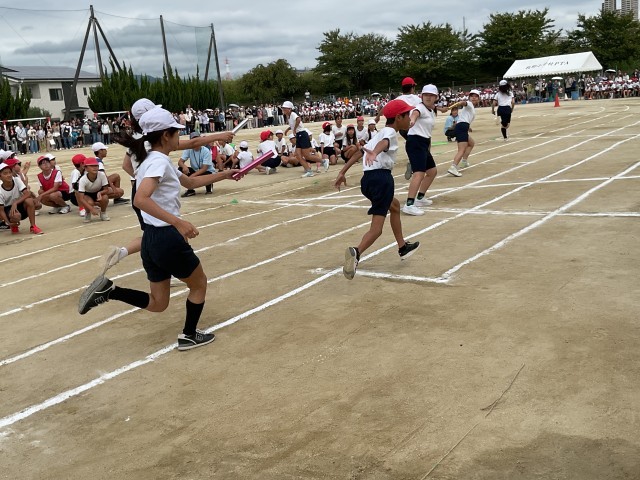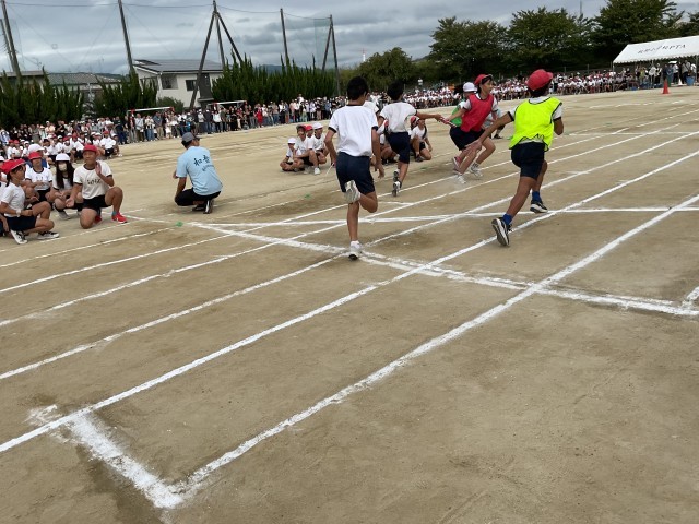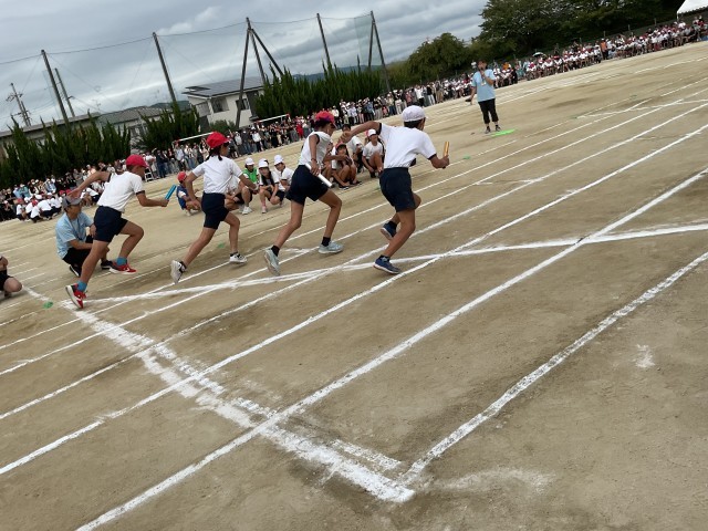 6年生のリレー、小学校生活最後の運動会を全力で楽しんでいます。