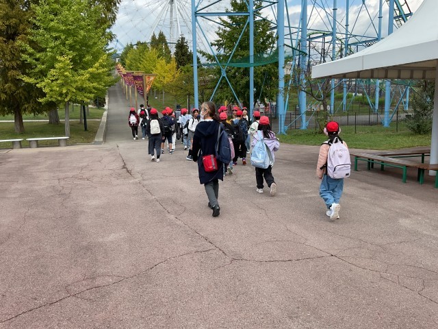 姫路セントラルパークのウォーキングサファリを終え、遊園地に到着しました。子どもたちは昼食のカレーを食べて、次々と遊園地に飛び出して行きました。