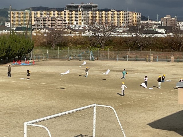 自分たちの手作りの凧を、運動場で揚げて遊んでいます。