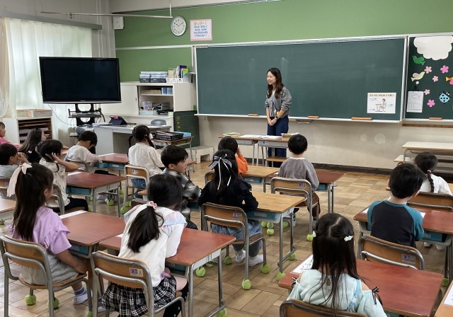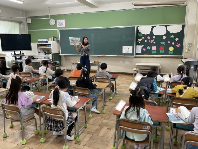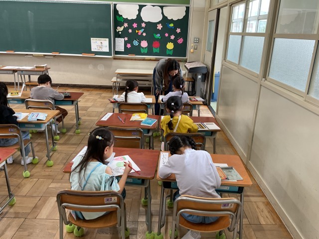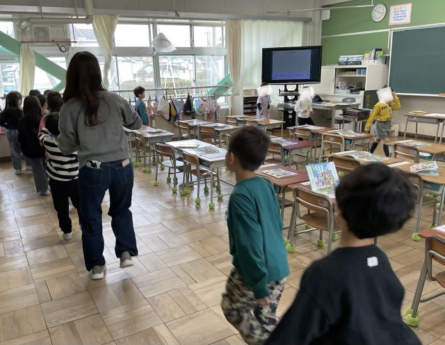 教科書を一緒に開いて、読み、次は、みんなで音楽に合わせて、体を動かします.