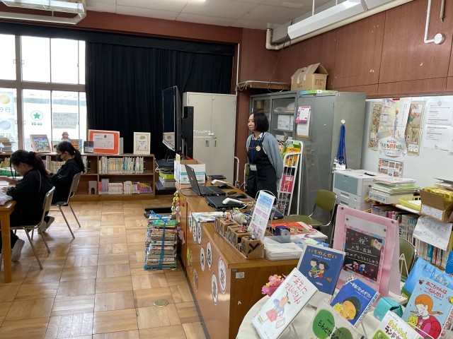6年生の図書の時間です。図書室には学校司書が配置され、