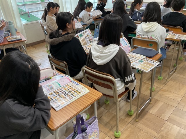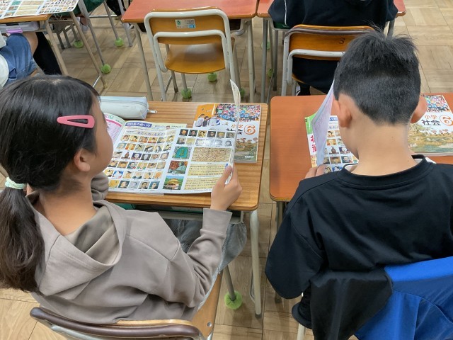 6年生が新しい社会の教科書をみんなで広げて、これから勉強する歴史や、偉人などのことを