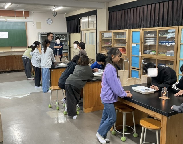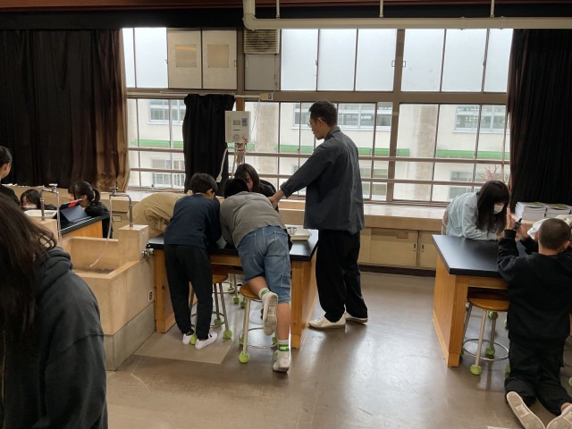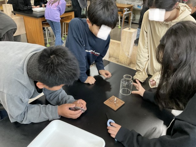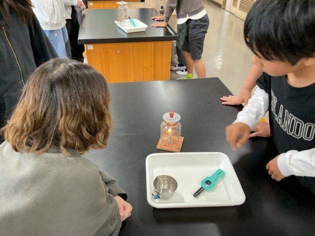 理科室で、「ものの燃え方と空気」の勉強で、ろうそくに火をつけて、