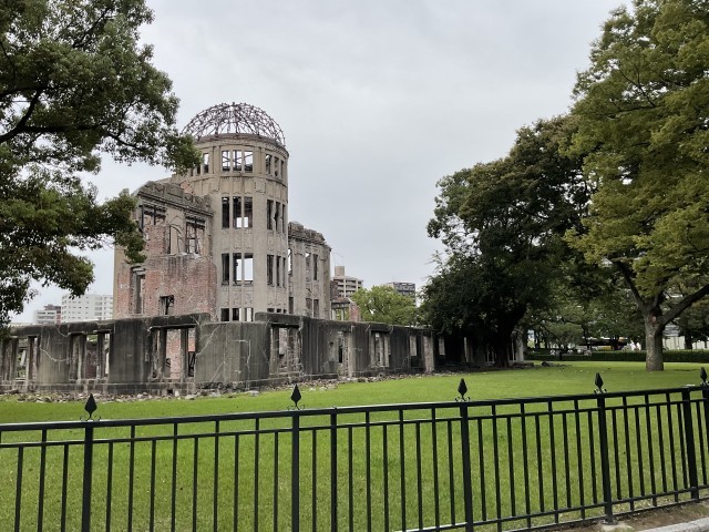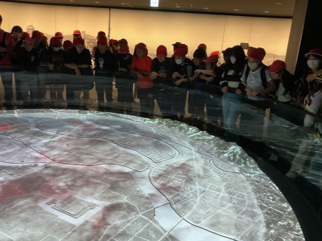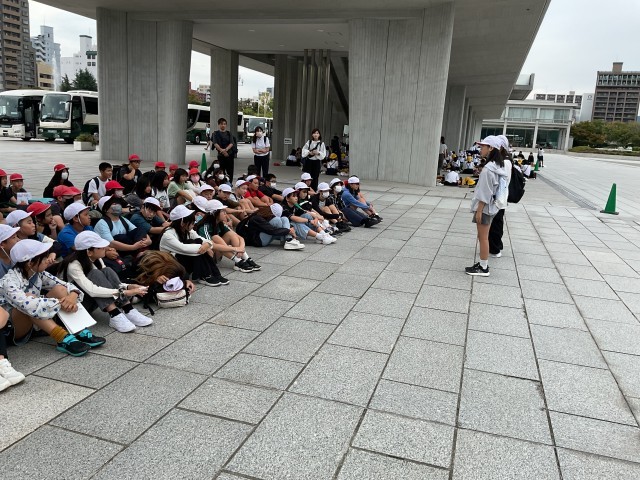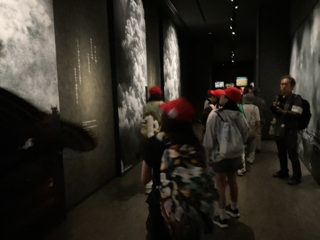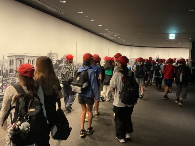 平和公園に到着しました。原爆ドームを見て原爆の物凄さを目の当たりにし、資料館の見学に向かいました。みんな本当に真剣に見学しています。