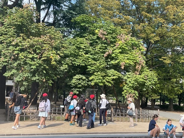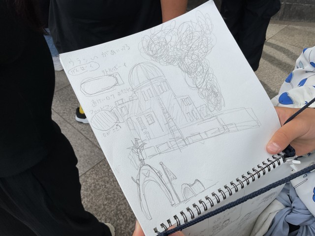 祈念の碑をめぐり、被爆したアオギリも見ました。学びをスケッチにしている人もいます。