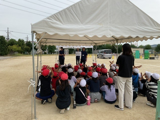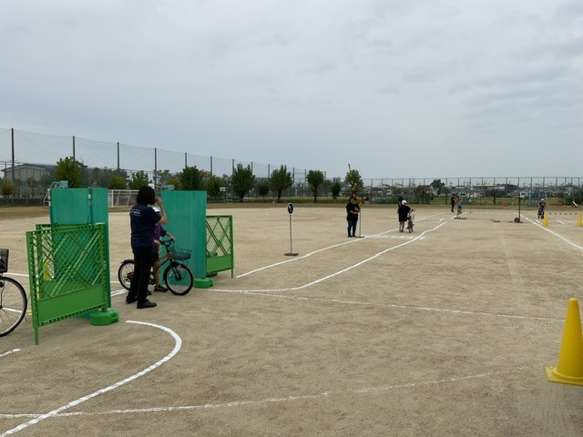 近隣の自動車教習所のスタッフの方にご来校いただき、自転車の乗り方についてご指導いただきました。クイズ形式で自転車乗車に係る交通ルールをご指導くださった後、運動場に作成した車道や線路等を活用し、教えてくださった交通ルールを意識し、実際に歩いたり自転車に乗りました。