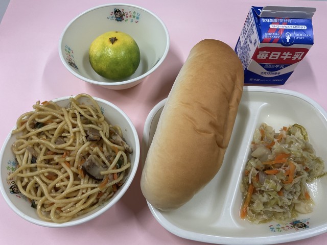 <今日のメニュー>きのこスパゲティ・ささみとキャベツのソテー・みかん・コッペパン・牛乳