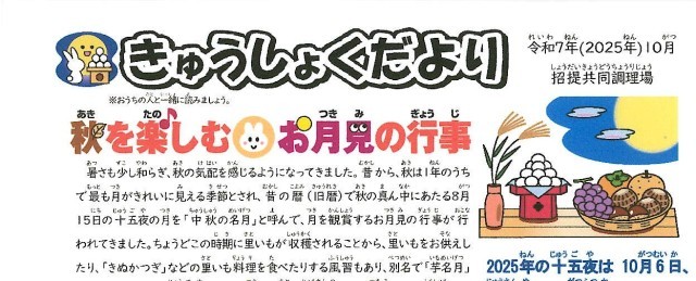 きゅうしょくだより10月号 公開日 2025/10/06 更新日 2025/10/06 お知らせ・緊急連絡 遅くなりましたが、きゅうしょくだより10月号をアップしました。こちらよりご覧ください。きゅうしょくだより10月(招提小共調)きゅうしょく・万博10月 いいね(0)