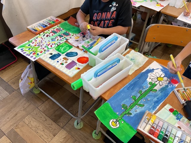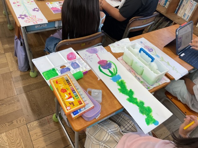 10月9日(木)花を描く 3年図工 公開日 2025/10/09 更新日 2025/10/09 3年生 細長い画用紙に、絵の具やクレパスを使って、思い思いの花の絵を描いています。それぞれの子どもたちの個性が光る素敵な作品が出来ています。 いいね(0)