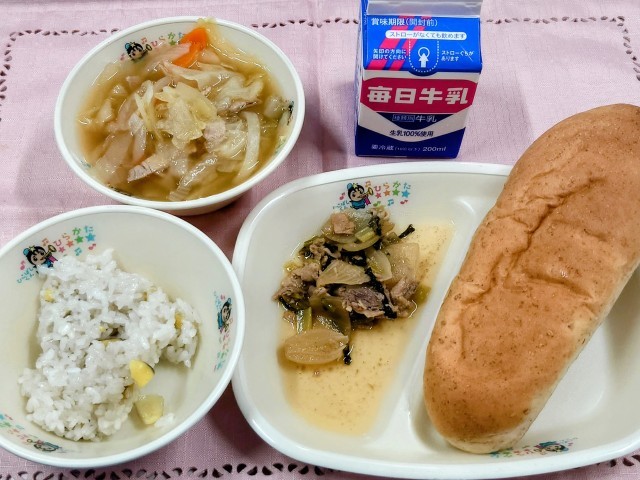 <今日のメニュー>野菜スープ・豚肉のオイスターソース炒め・栗おこわ・ゴマパン・牛乳