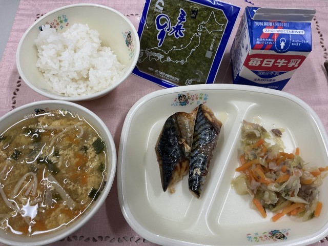 <今日のメニュー>かき玉汁・キャベツの炒め物・焼き鯖手巻き(焼き鯖・焼き海苔・寿司ご飯)・牛乳