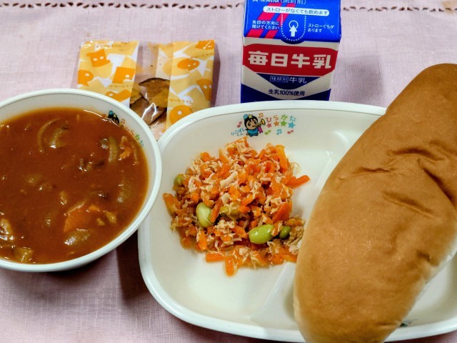 <今日のメニュー>ハッシュドポーク・ささみとにんじんのサラダ・さつまいもチップス・コッペパン・牛乳