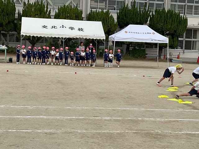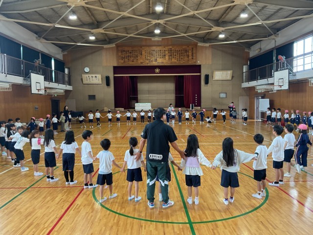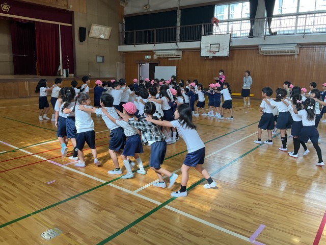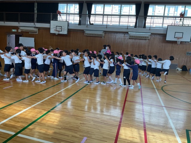 今日は敬応学園幼稚園の皆さんが交流に来てくれました。1年生の運動会の練習を運動場で見た後、体育館で一緒に遊びました。懐かしい幼稚園の先生との再会もあり、楽しい時間を過ごしましたね。みなさん、来年交北小学校で待ってるよ。