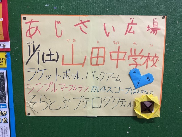 昨日、「まなびポケット」にて「山田ふれあいひろば」の実施についてご案内いたしましたが、本日、山田中学校の生徒の皆さんが、手作りのポスターを本校まで持ってきてくれました。美術部やあじさい学級の皆さんをはじめ、有志による企画もあるとのことです。