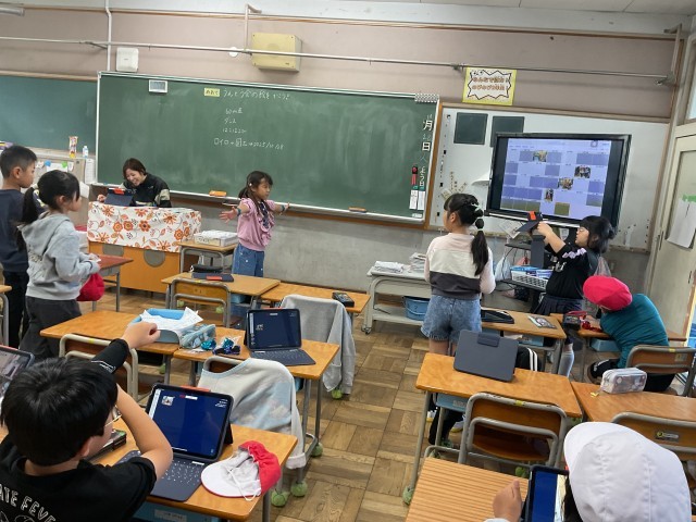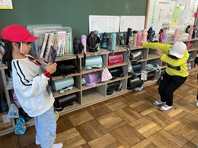 2年生の教室では、ポーズをとった相手をタブレットで撮影しています。みたことのある様なポーズ・・と思ったら、運動会のダンスのポーズです。重い思いのポーズを撮影してもらい、これからそれを参考にして、運動会の絵を描いていくのだそうです。頑張った運動会、素敵な絵ができることでしょう。