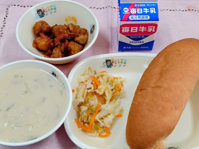 <今日のメニュー>インゲン豆尾クリームスープ・肉ボール・ラハノサラダ・コッペパン・牛乳