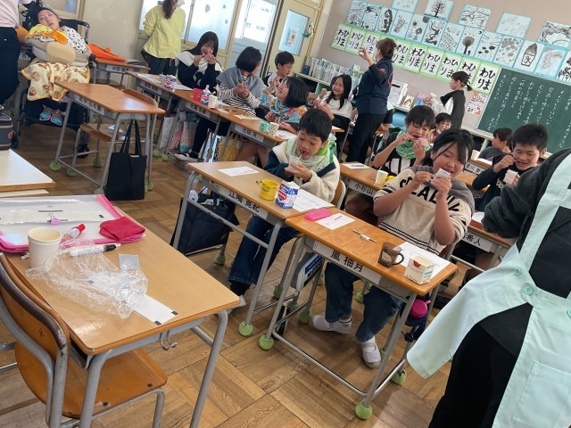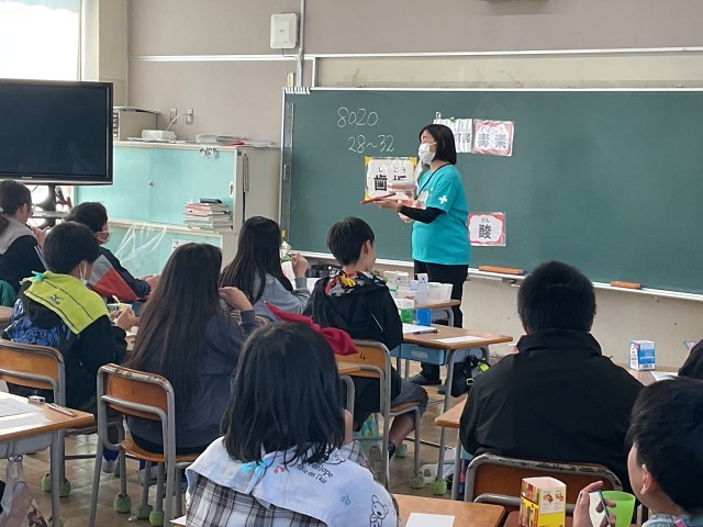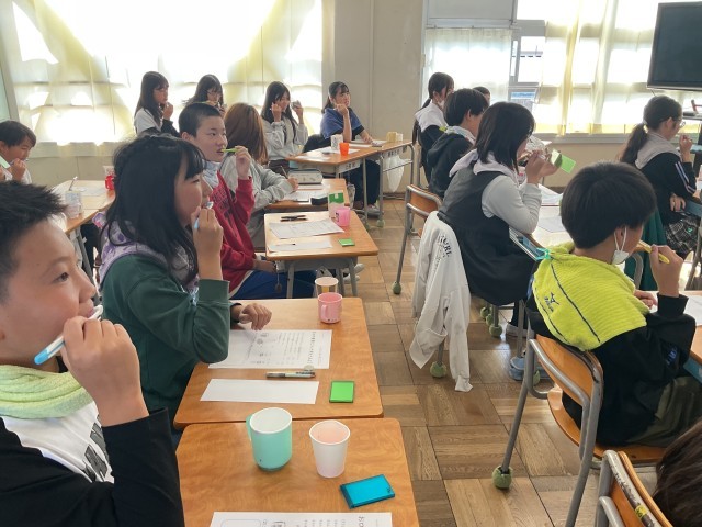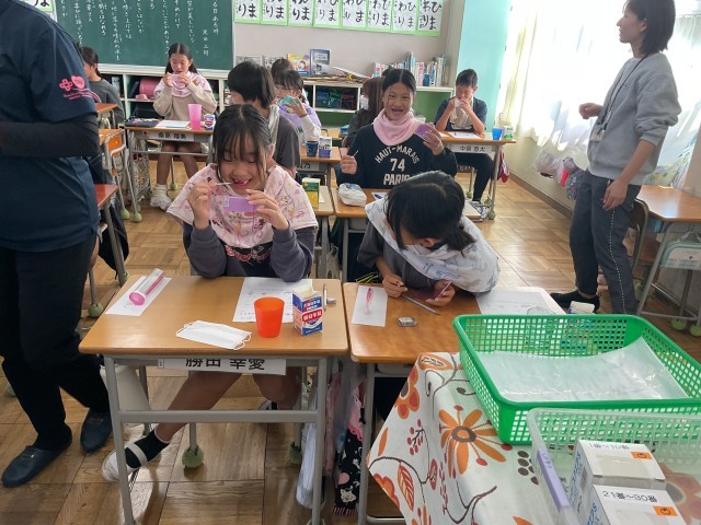 3時間目は6年生。歯周病の怖さのお話などを聞いた後、6年生も歯垢染色液をおそるおそるつけてみます。磨き残していたところは、歯ブラシできれいにしました。
